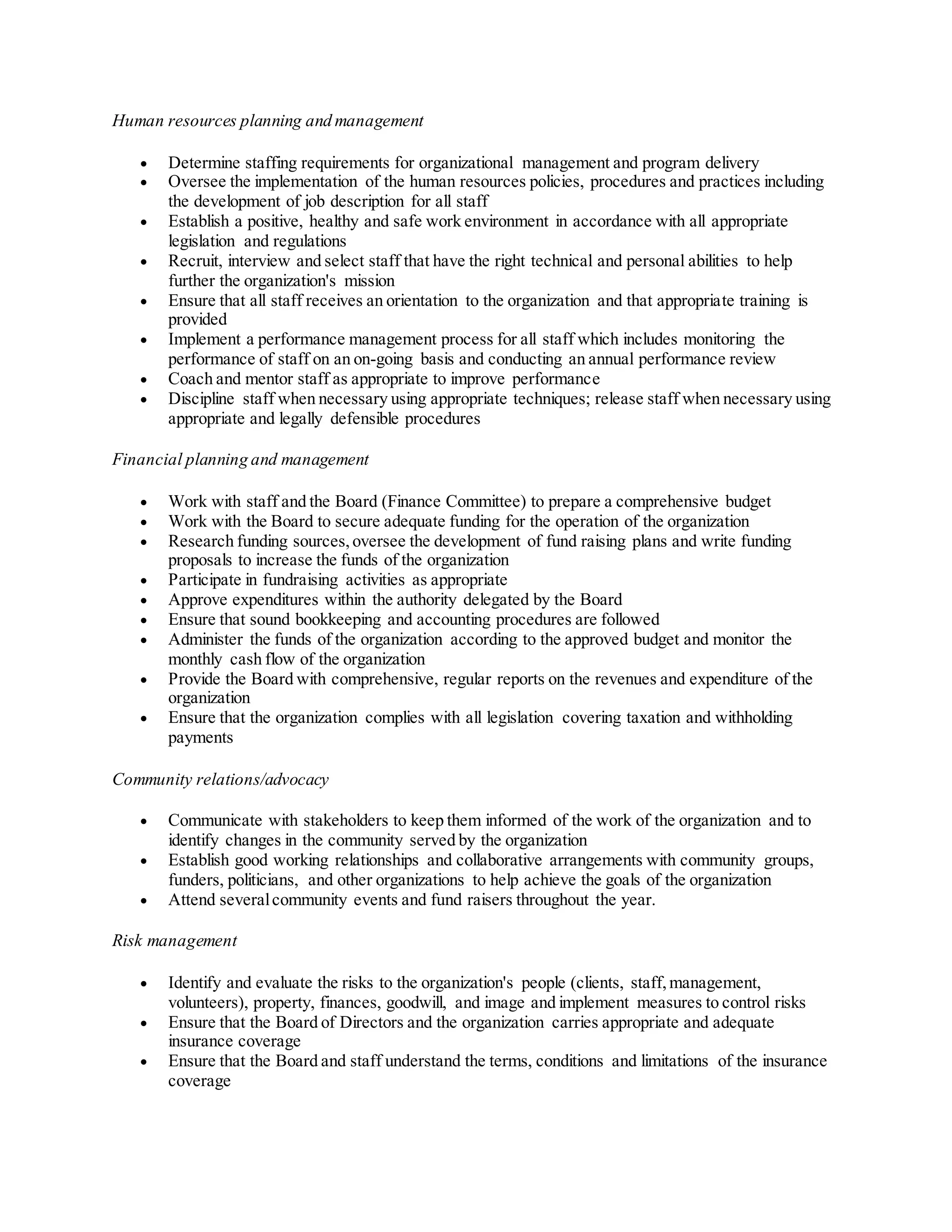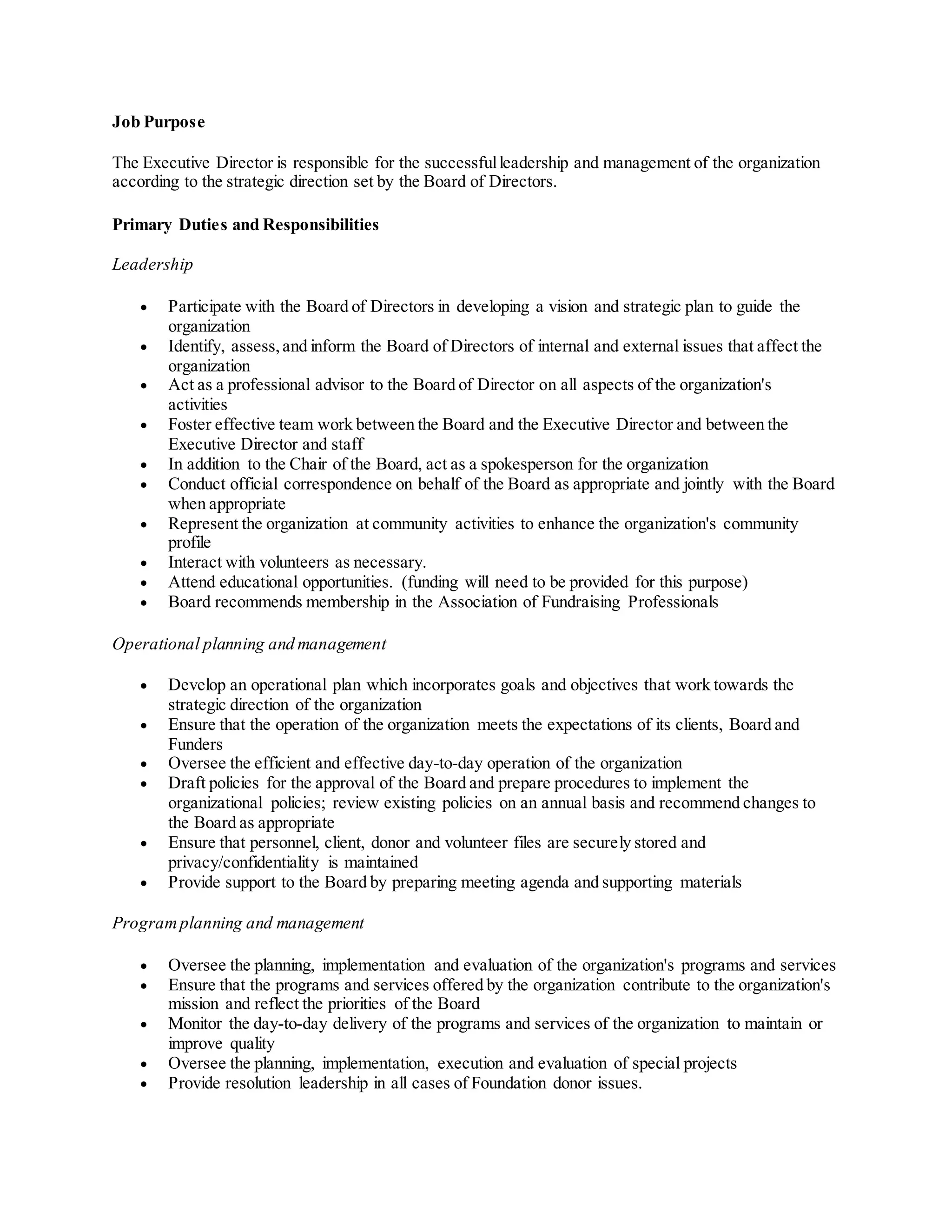 The Executive Director is responsible for the overall leadership and management of the organization according to the strategic direction set by the Board of Directors. Their primary duties include developing a vision and strategic plan with the Board, managing the day-to-day operations, overseeing programming and services, managing finances and fundraising, leading human resources, and representing the organization externally. They work closely with the Board of Directors and staff to achieve the organization's mission.