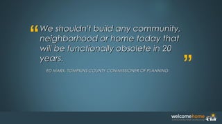 The document presents a project aimed at building sustainable communities, focusing on green building, energy efficiency, and social support systems. It highlights ten key principles for sustainable living, emphasizing density, local food production, and preserving open space. Success stories from the Ecovillage at Ithaca and other neighborhoods illustrate practical implementations of these principles.