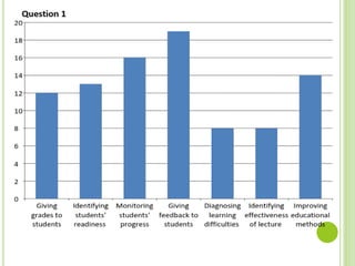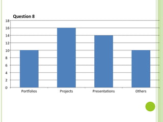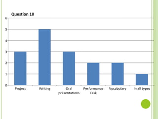 This document outlines a research project conducted by a group of students called "Lilies" on teacher perceptions and use of assessment. The group surveyed 22 teachers from various schools to determine what types of assessments they use and how they perceive assessment. The results showed that most teachers were familiar with and used placement, formative, summative, and performance-based assessments. However, fewer teachers understood or used rubrics. The group suggested providing teachers with more assessment tools and training to help expand their assessment practices.