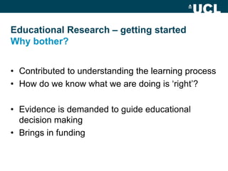 This document provides an overview of getting started in medical educational research. It discusses why educational research is important, key differences between educational and scientific research, common research methods such as interviews and surveys, important ethical considerations, potential funding sources, and developing a research question. The presenter encourages attendees to think about a potential research proposal and provides examples of possible research themes.