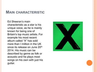 Ed Sheeran is known for his unique voice and folk/acoustic music style, where he plays guitar and sings. He demonstrates the paradox of being both ordinary and extraordinary - while he started by playing on street corners, he has immense musical talent. Ed Sheeran also embodies the paradox of being both present and absent - he performs concerts and TV appearances to be present with fans, but is otherwise quite private, creating demand for more of his star persona.