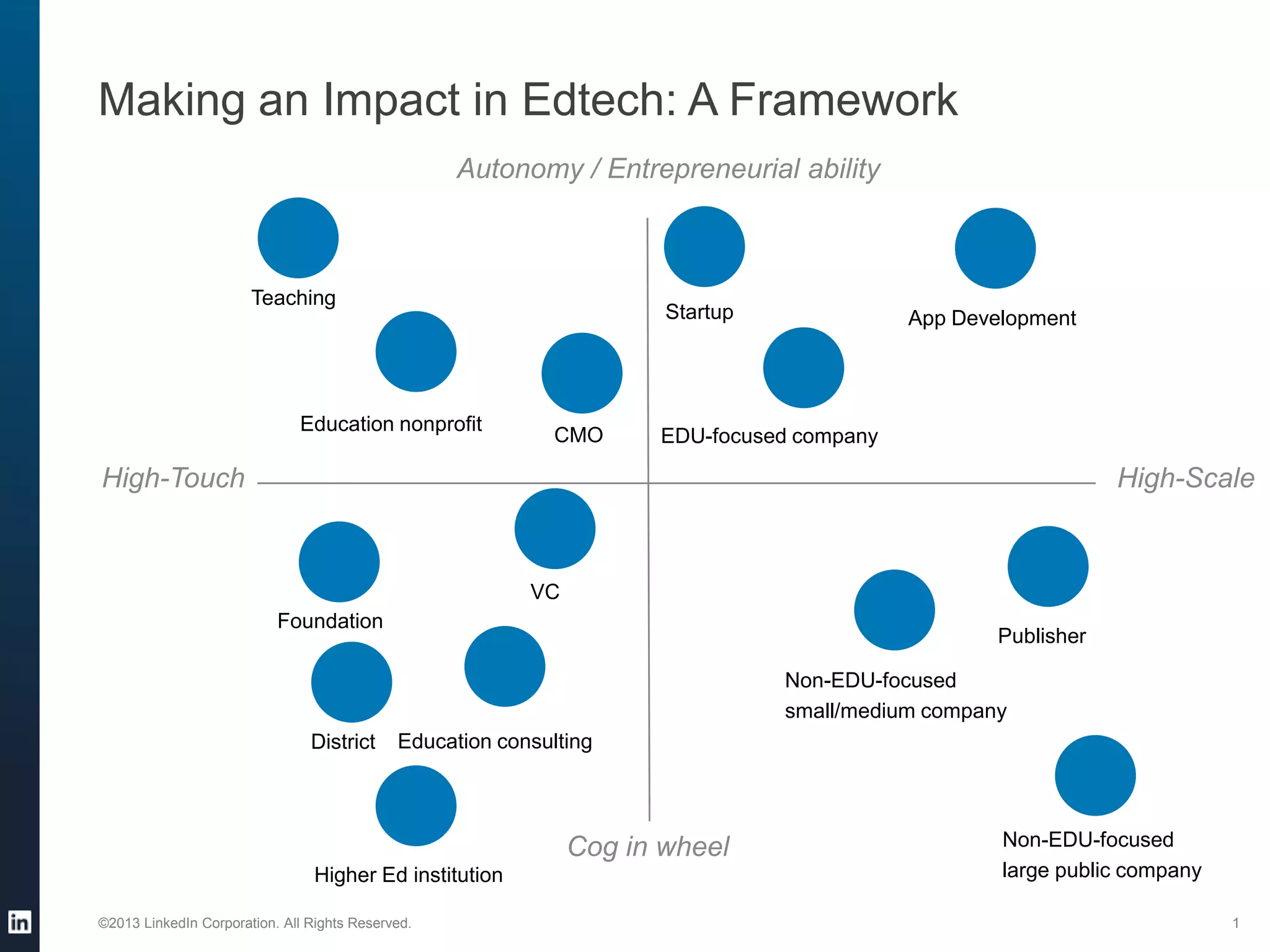 The document provides insights on making an impact in the edtech industry, emphasizing the importance of staying informed, developing expertise, and valuing traditional education experience. It also highlights the significance of culture, teamwork, and continuous learning in achieving success. Additionally, it suggests considering one's desired position on the 'impact' spectrum, which may evolve over time.