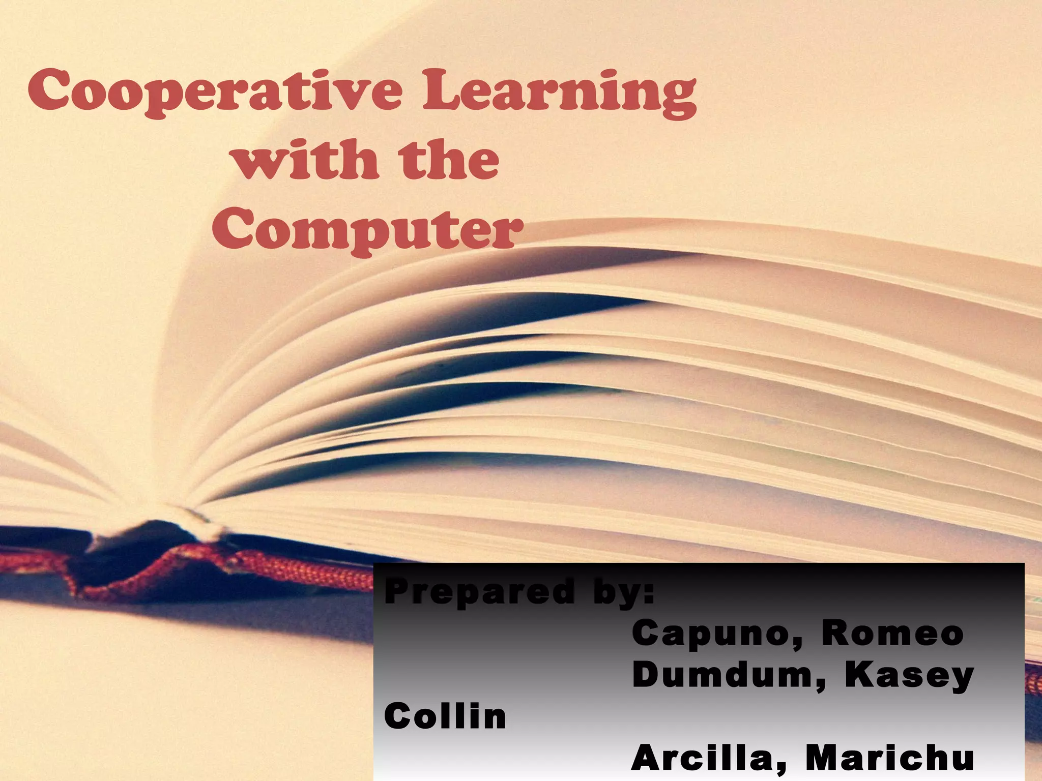 Cooperative learning involves students working together in small groups on common tasks. There are five elements: individual accountability, interdependence, interaction, social skills, and common goals. Cooperative learning has advantages like improving academic performance and social skills. Studies show computers can support cooperative learning when students work together for advice instead of alone. Teachers must assign mixed-ability teams and ensure elements like accountability and processing to achieve collaborative learning with computers.