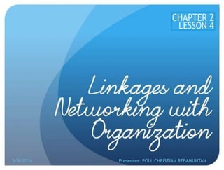 This document discusses various international, national, and local linkages of an educational institution. It describes an international honor society that supports student teachers through graduation called Excellence in Teaching Project (ETP). It also mentions SEAMEO as a center for training educational leaders from Southeast Asia. Nationally, it discusses consortiums between universities for cross-enrollment and joint research. Locally, it outlines networking with professional organizations, foundations, government offices, and media outlets.
