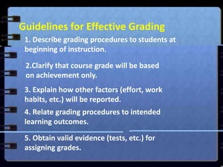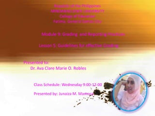 The document is a module presentation for a class at Mindanao State University College of Education in General Santos City, Philippines. It discusses guidelines for effective grading, including describing grading procedures to students, clarifying that course grades will be based on achievement only, explaining how other factors will be reported, relating grading procedures to intended learning outcomes, obtaining valid evidence for assigning grades, preventing cheating, promptly returning and reviewing test results, properly weighting achievements, not lowering grades for non-achievement factors, and being fair and avoiding bias. The presentation was delivered to Dr. Ava Clare Marie O. Robles on Wednesday from 9:00-12:00 by Junaiza M. Mamoca.
