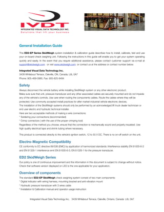 The document provides installation and calibration instructions for an ED2-EP Series SkidWeigh check weighing system. It describes installing the pressure transducer in the vehicle's lifting hydraulic circuit and mounting the digital indicator. The calibration procedure involves lifting empty and loaded forks to automatically zero the scale and set the load value. Proper electrical connections and a quick test are described to ensure correct installation before calibration.
