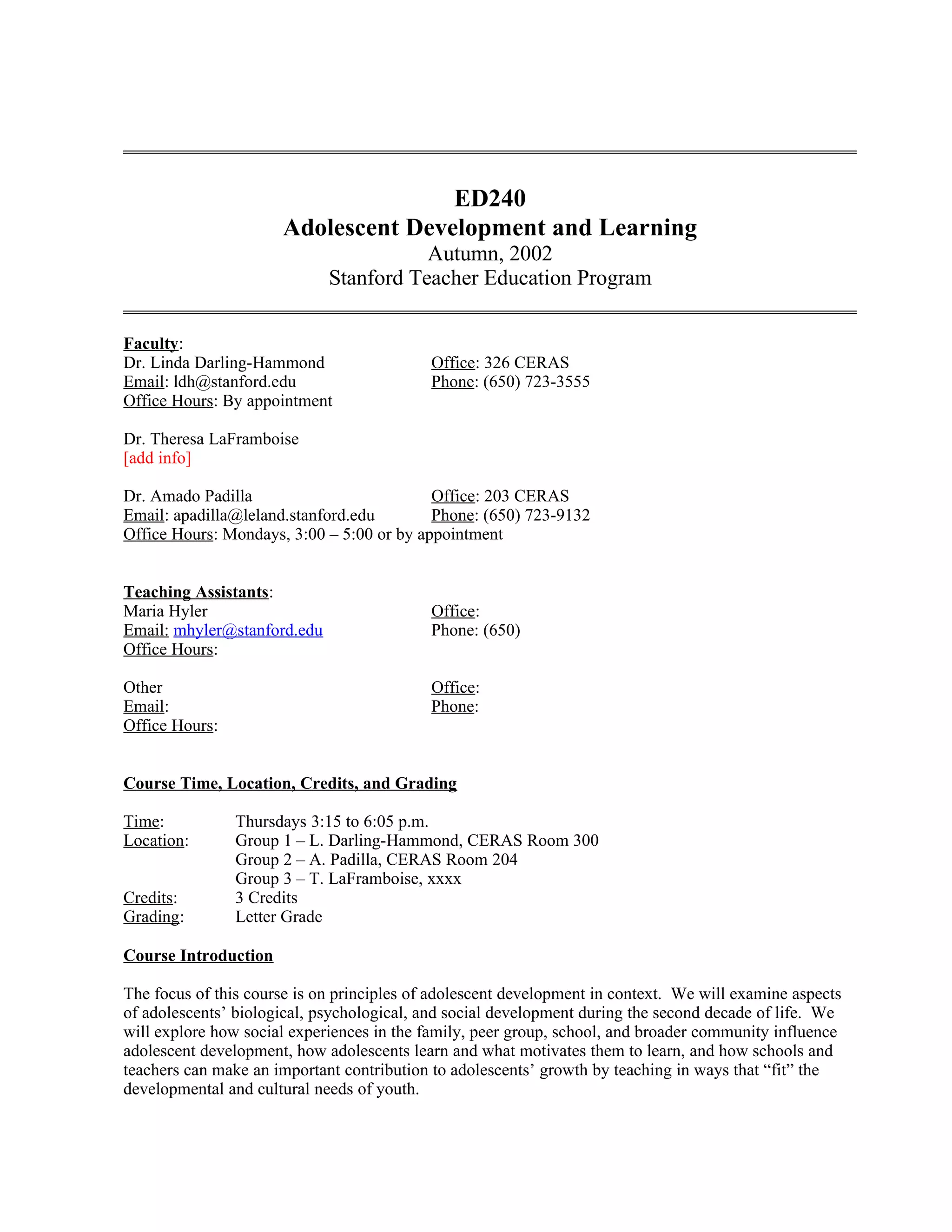 1) The course is taught by three professors and meets on Thursdays from 3:15-6:05pm, divided into three groups. Readings focus on adolescent development in context.
