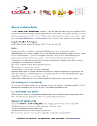 This document provides instructions for installing and calibrating an on-board weighing and dimensioning system for lift trucks used in the LTL freight industry. It describes connecting the pressure transducer, indicator unit, and other components. The system operates by measuring hydraulic pressure when a pallet load is lifted to calculate the weight. Proper installation and calibration procedures are outlined to ensure accurate weighing.