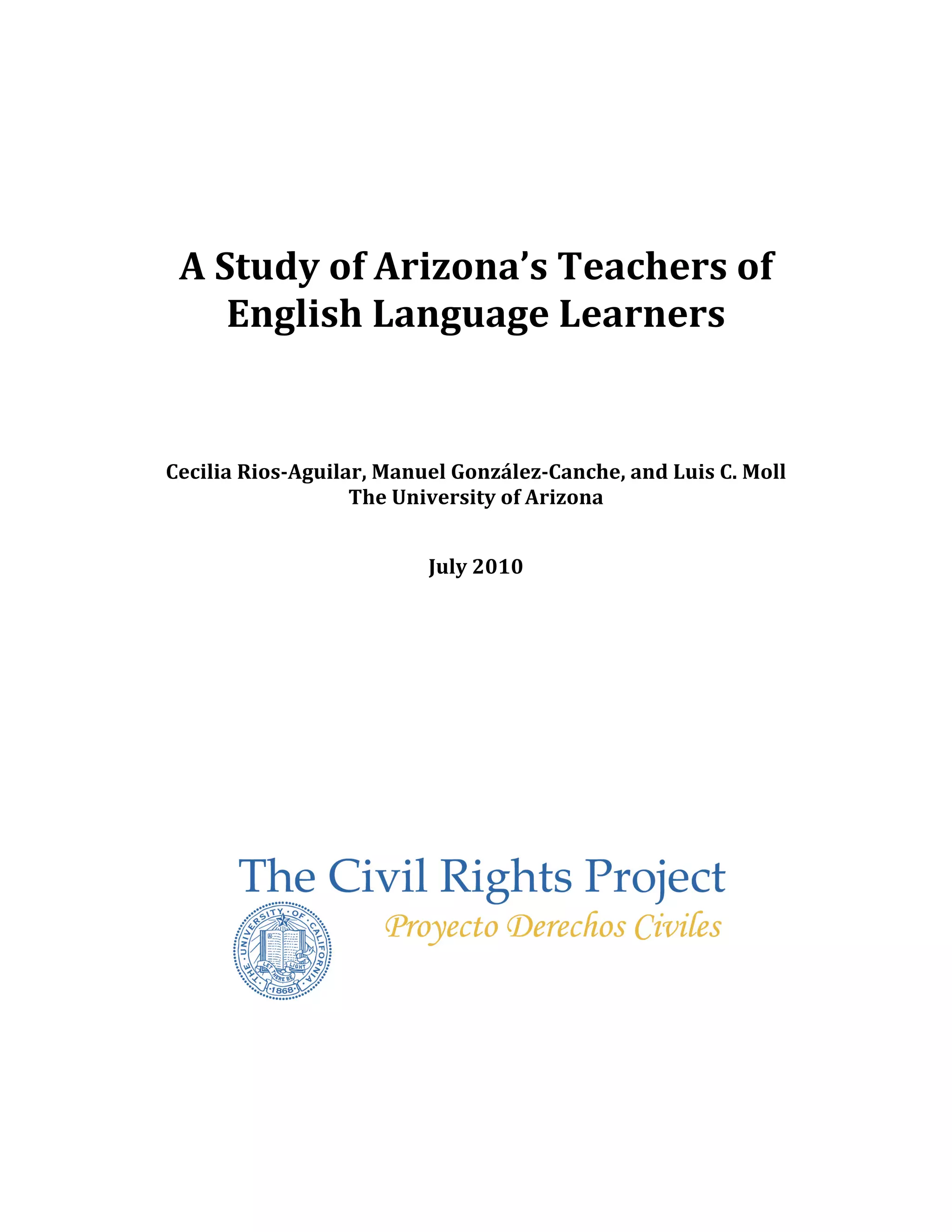 This study surveyed 880 teachers across 33 schools in Arizona about their perceptions of the instructional policies for English Language Learner (ELL) students. The majority of teachers believed that the 4-hour English Language Development block intended to accelerate English proficiency was not helping ELL students catch up academically. Most teachers also believed that separating ELL students from English-speaking peers in this way was harmful. The study recommends that Arizona consider alternative instructional models to help ELL students succeed while still providing support from English-speaking peers.