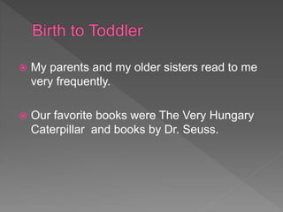 The document describes the development of the author's reading abilities from a young age when their family frequently read to them. In kindergarten, the author learned letter sounds and began reading words on their own. Throughout middle school and high school, the author enjoyed reading mystery books at home and series like Harry Potter. While college left less free time for reading, the author now finds time to read most nights as a way to relax.
