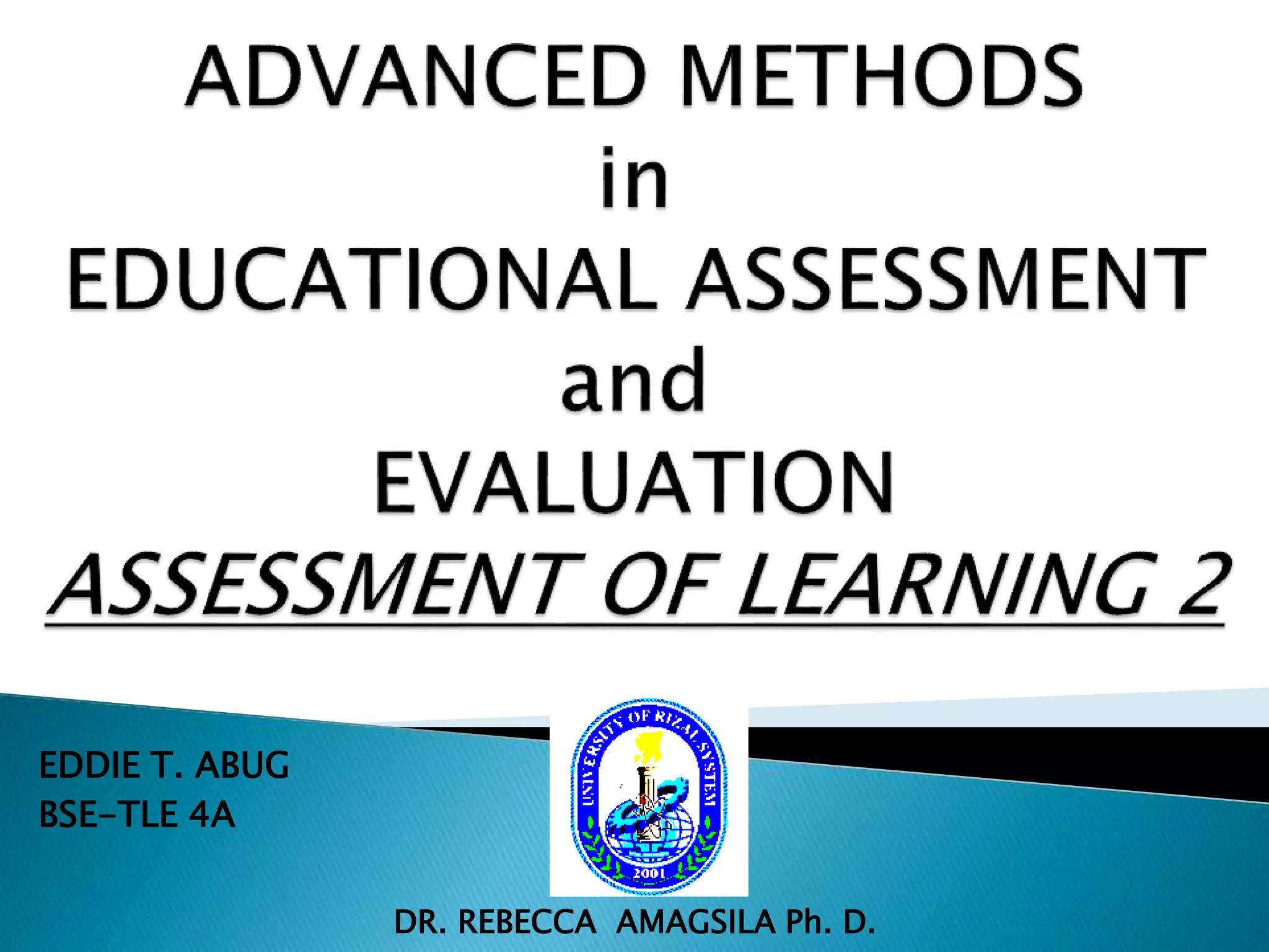 This document discusses principles of high quality assessment. It begins by emphasizing the importance of clearly defined learning targets in order for assessments to be precise and accurate. It then examines different types of learning targets, including cognitive targets, skills/competencies, and products/projects. Various assessment methods are explored, including written responses, rating scales, oral questioning and observation. Key properties of effective assessments are outlined, such as validity, reliability, fairness and practicality. Specific assessment tools are defined, like checklists and rating scales. The document provides a comprehensive overview of fundamental concepts for designing high-quality assessments.