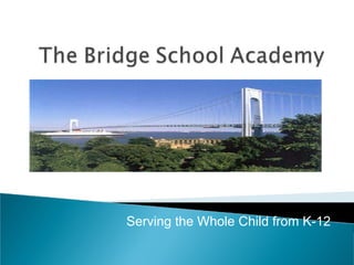 The Bridge School Academy is a K-12 school that takes a holistic approach to educating children to be ready for college and face 21st century challenges. It focuses on developing global awareness for a diverse student population through blended classrooms using technology, partnerships with organizations, and making the campus a community learning environment.
