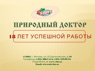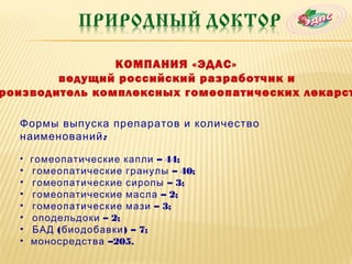 Компания «Эдас» занимается производством гомеопатических лекарств, предлагая широкий ассортимент препаратов, включая капли, гранулы и сиропы. Продукция включает в себя средства для лечения различных заболеваний, такие как хронические воспаления, кардиологические и неврологические расстройства, а также имеет минимальные побочные эффекты и высокую совместимость с традиционными лекарствами. Все препараты основаны на натуральных ингредиентах и проходят строгий контроль качества.
