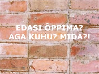 EDASI ÕPPIMA? AGAKUHU? MIDA?! Kui sul pole aimu kuidas alustada või sa isegi täpselt ei tea, mida ja kus õppida tahaksid, siis alusta veebilehelt Rajaleidja http://www.rajaleidja.ee Rajaleidja on loodud toetamaks karjääriplaneerimist.