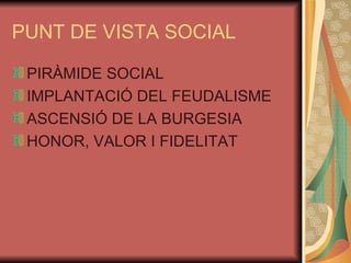 This document provides an overview of medieval culture and society in Catalonia from the 12th to 15th centuries. It discusses the rise of feudalism and the bourgeoisie, the birth of Romance languages, and the focus on theology and morality in the arts. It also mentions the troubadours and their courtly love tradition, Ramon Llull as one of the first authors to write in Catalan, and the influence of Italian humanism. Finally, it provides brief summaries of important literary works from this period, including Tirant lo Blanc, Curial e Güelfa, and the poetry of Ausiàs March.