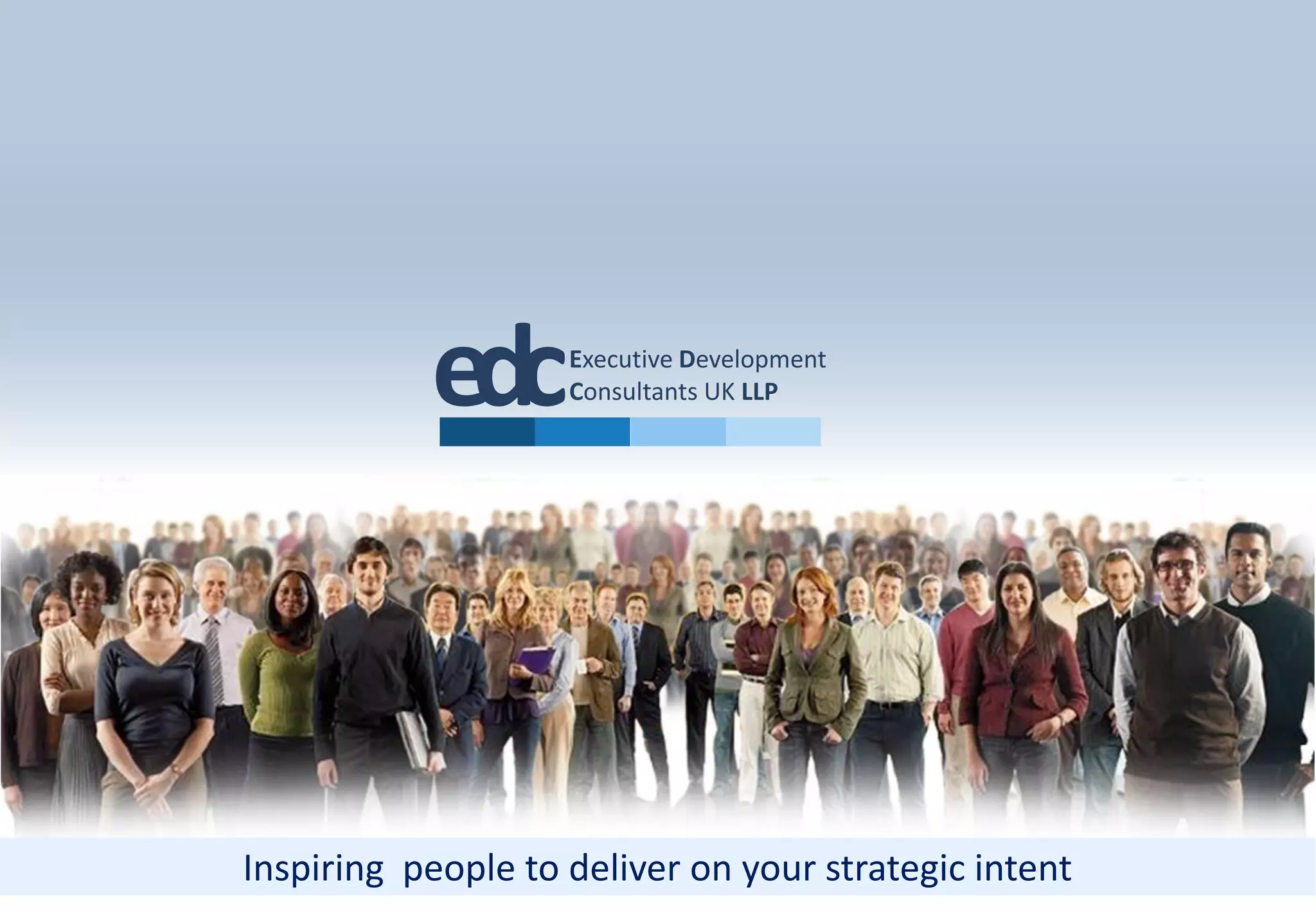 Executive Development Consultants UK LLP provides executive coaching and leadership development services to individuals and organizations. Their services include individual and team coaching, board-level coaching for CEOs and directors, and coaching programs focused on leadership skills, promotion preparation, and navigating the first 100 days in a new role. EDC uses diagnostic tools like personality assessments and 360-degree feedback to inform customized coaching engagements and help clients improve performance. They have experience working with clients across various industries in both the public and private sectors.