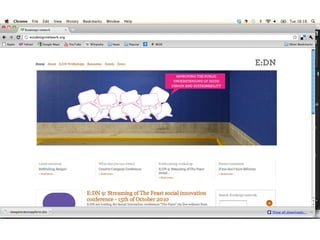 This document discusses supporting sustainability and ecodesign in the design sector through research, knowledge exchange, and international partnerships. It notes that while other business sectors have received sustainability support, the design sector remains underrepresented. The proposed support would include strategic consultations, papers, and conferences as well as applied and basic research efforts.