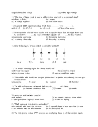 The document discusses diodes and other semiconductor devices. It contains 25 multiple choice questions about diode characteristics and applications. Specifically, it covers topics like diode testing, LED operation voltages and power ratings, rectifier output frequency, and the dominance of different capacitances in forward and reverse bias regions. The answers to the 25 questions are provided at the end.