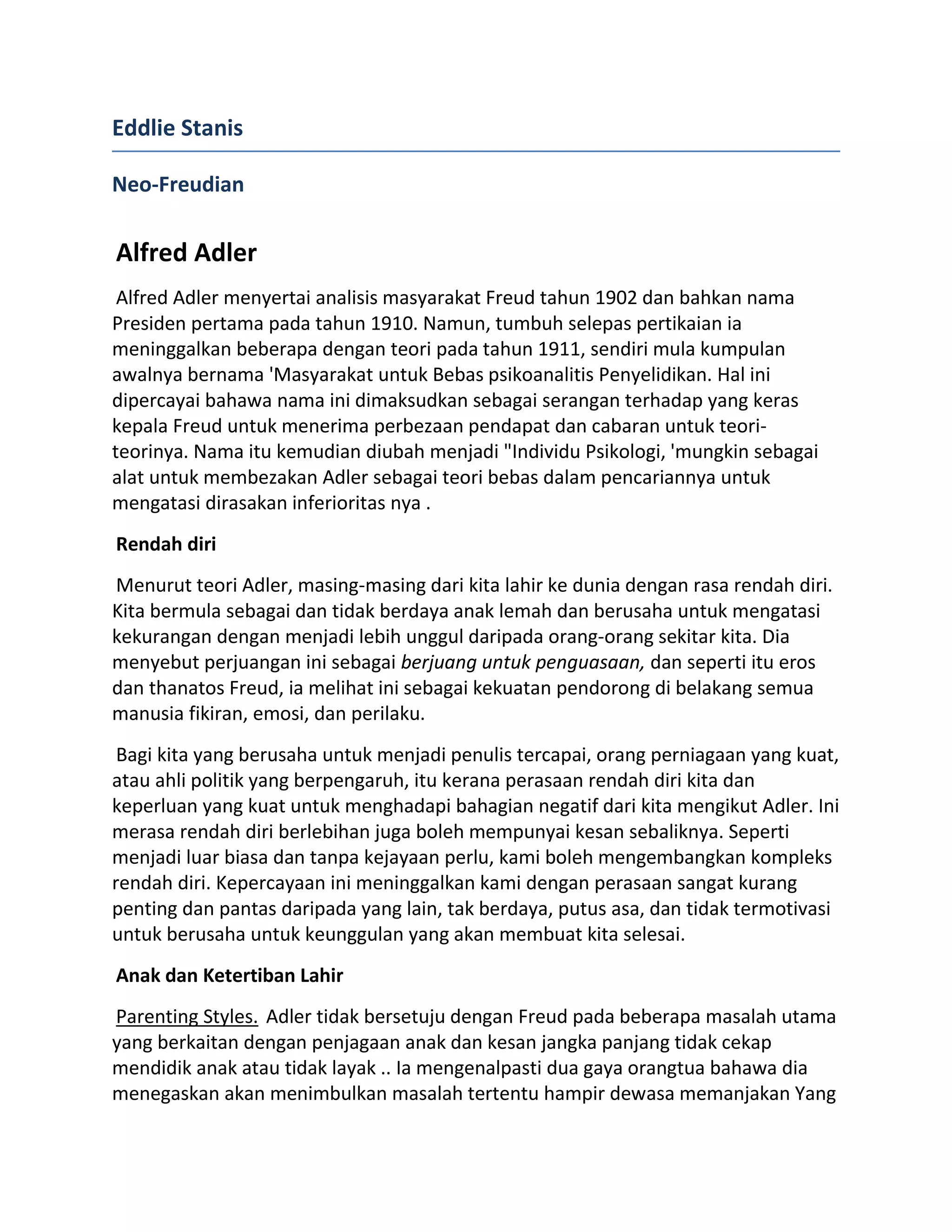 Alfred Adler berpisah dari masyarakat psikoanalisis Freud pada tahun 1911 karena perbedaan pendapat dan mendirikan teori psikologi individunya sendiri. Ia meyakini bahwa perasaan inferioritas memainkan peran penting dalam pembentukan kepribadian seseorang dan dipengaruhi oleh faktor-faktor seperti tata keluarga dan urutan kelahiran. Carl Jung juga berpisah dari Freud karena keyakinannya bahwa ada arketipe kolektif