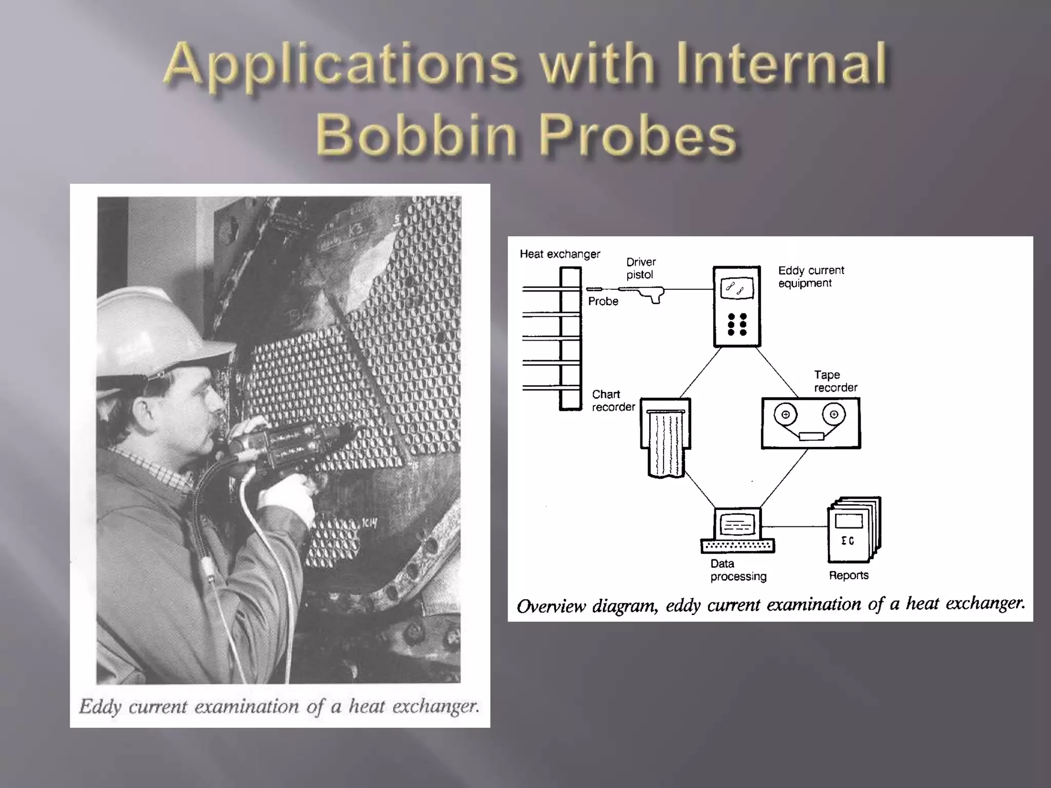 Eddy current testing uses a coil to generate an alternating magnetic field that induces eddy currents in a conductive test material. Interruptions in the eddy currents from defects can be detected by changes in the secondary magnetic field and fed back to the testing equipment. It is used for applications like crack detection, material thickness measurement, and coating thickness measurement due to providing immediate results on conductive materials with accessible surfaces. Limitations include being unable to inspect non-conductive materials and detect certain defect orientations.