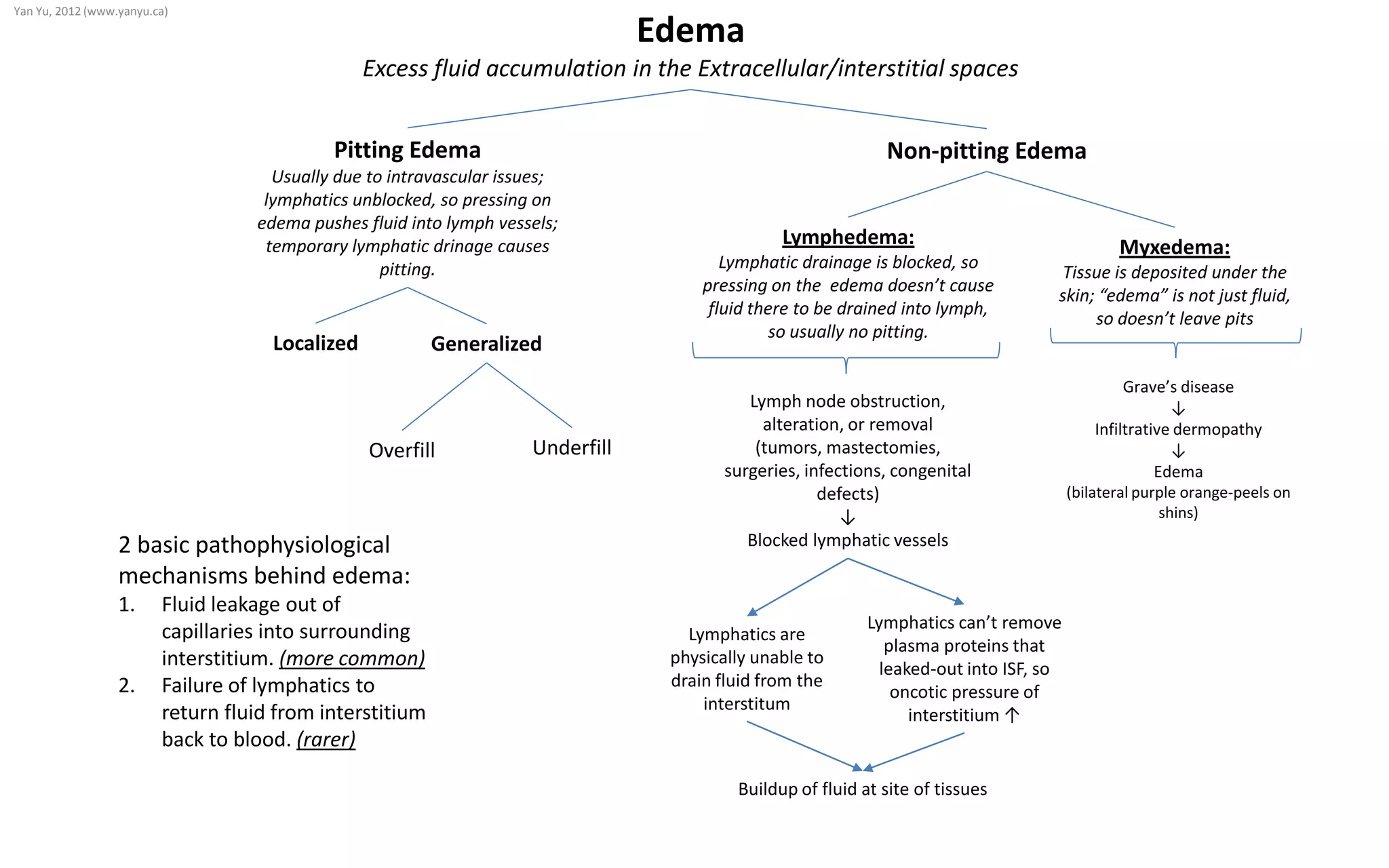 Lymphedema is caused by blocked lymphatic drainage, which prevents fluid from being drained from tissues into lymph vessels. This results in non-pitting edema, as pressing on the swollen area does not cause indentations since fluid cannot be pushed into blocked lymphatics. Pitting edema is usually due to issues within blood vessels and occurs when lymphatics are unblocked, allowing pressing on the swollen area to temporarily drain fluid into lymphatic vessels, forming indentations. There are two main causes of edema: 1) fluid leakage from capillaries into tissues, and 2) failure of lymphatics to return fluid from tissues back to the bloodstream. Lymphedema occurs when lymph nodes