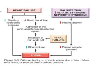 Edema is the accumulation of fluid in the interstitial spaces of tissues. It occurs when there is increased hydrostatic pressure forcing fluid out of blood vessels or decreased plasma oncotic pressure pulling fluid back into blood vessels. The two main types of edema fluid are transudate, which is low in protein, and exudate, which is high in protein due to increased vascular permeability. Common causes of edema include increased venous pressure from conditions like heart failure or DVT, reduced plasma proteins from liver or kidney disease, lymphatic obstruction, sodium and water retention by the kidneys, and increased vascular permeability during inflammation.