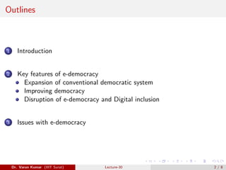 The document discusses e-democracy, which uses information and communication technologies to expand and improve democratic processes. E-democracy can enhance democracy by enabling electronic voting, improving civic engagement through online political discussions and information sharing, and allowing more direct participation between citizens and representatives. However, e-democracy systems face issues like ensuring effective citizen participation, voting equality, and addressing cybersecurity risks and protecting sensitive user data. Digital inclusion is also important to ensure all citizens can participate in e-democracy.