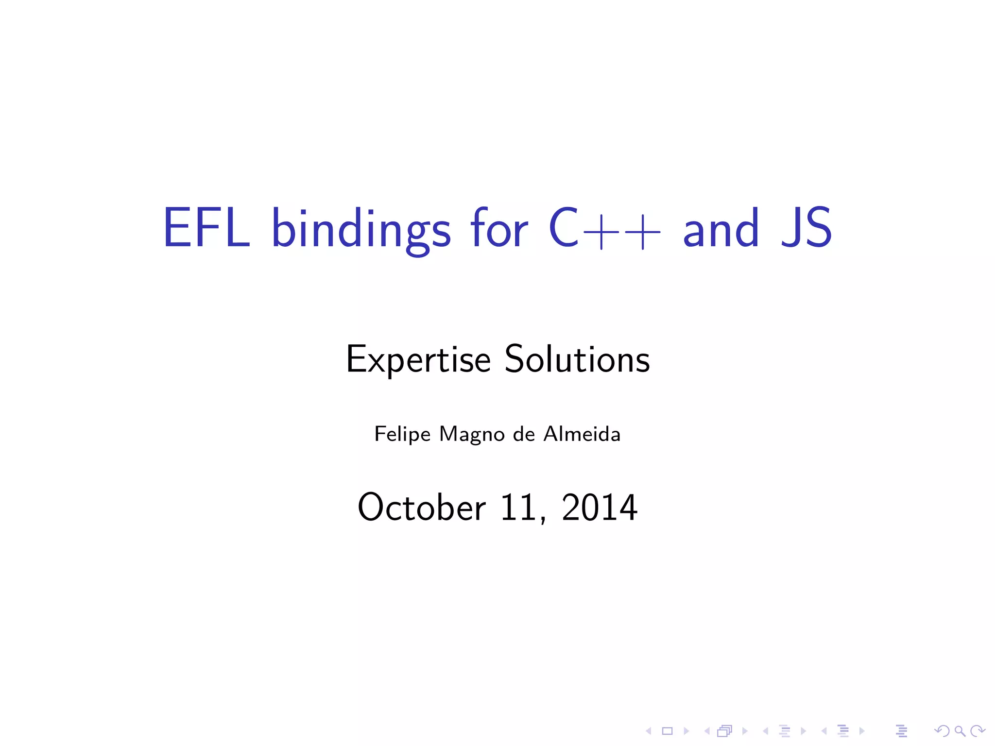 The document discusses the ongoing development and status of C++ and JavaScript bindings for EFL (Enlightenment Foundation Libraries), indicating that the C++ bindings are in the stabilization phase while JavaScript bindings are in early development. It highlights a focus on performance and modern API features in C++, aiming to avoid dependence on Boost libraries, and explores potential APIs that align with JavaScript developers' expectations. Additionally, it presents ideas for building on JavaScript and Lua bindings, emphasizing portability and user interface considerations.