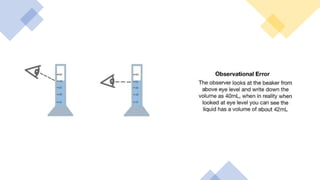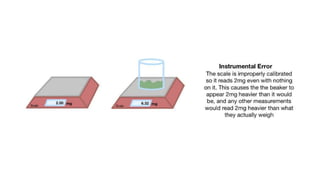 The document explains two types of errors in experimental physics: random errors, caused by chance and variability in measurements, and systematic errors, which consistently deviate from the true value, often due to inaccurate instruments or procedures. It outlines how to determine measurement uncertainty, emphasizing the importance of writing measurements in the format 'value ± uncertainty,' and describes how to calculate absolute and percentage uncertainties for addition, subtraction, multiplication, and division. Furthermore, the text defines accuracy and precision in measurements and provides examples to illustrate different relationships between measured values and true values.