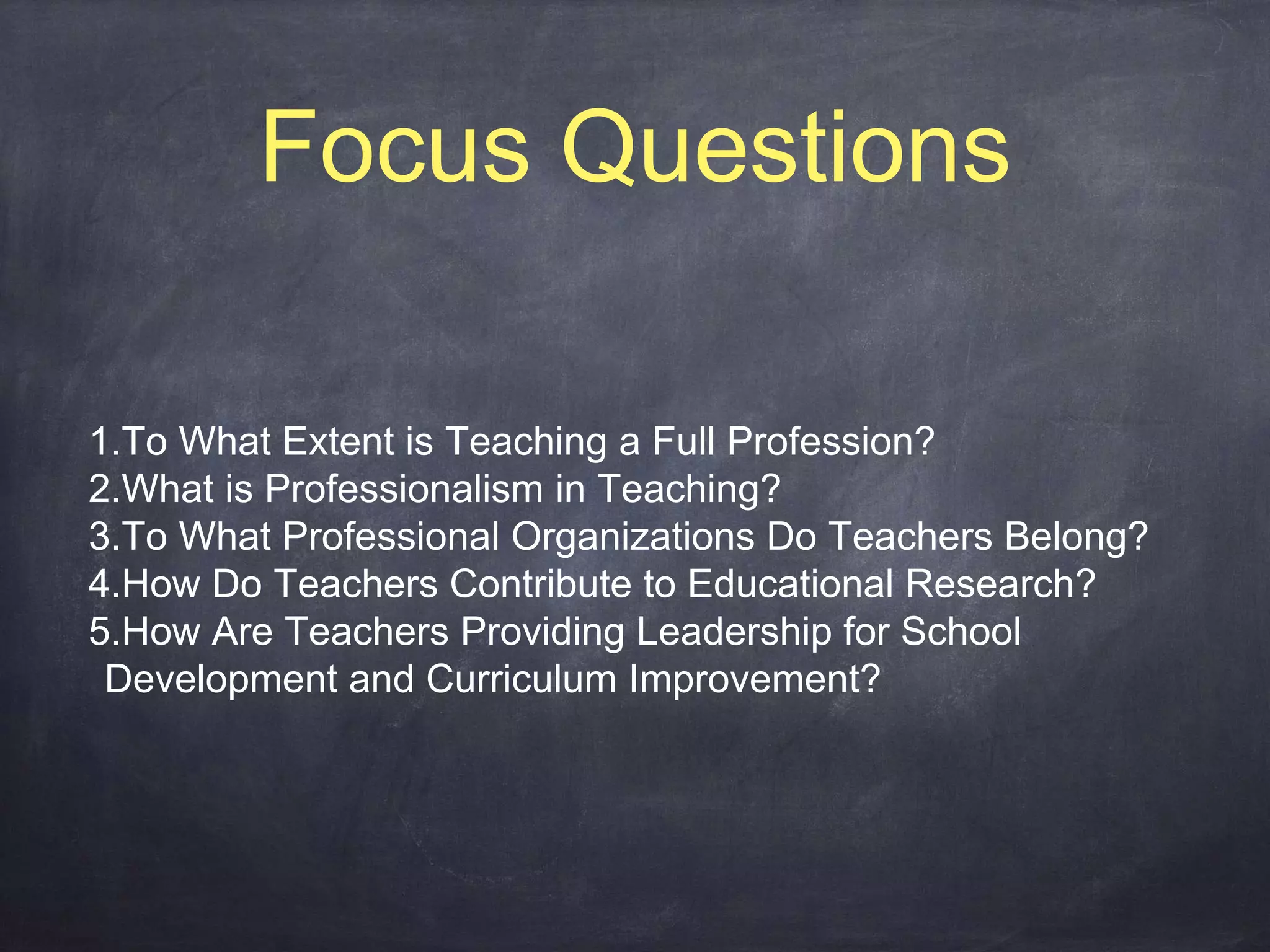 This document discusses leadership in education and teaching as a profession. It begins by outlining five focus questions on the extent to which teaching is a full profession, what professionalism in teaching entails, what professional organizations teachers belong to, how teachers contribute to educational research, and how teachers provide leadership for school development and curriculum improvement. The document then addresses each of these questions in turn, noting ways that teachers demonstrate leadership, skills, and knowledge; belong to unions and professional associations; engage in action research; and help reform schools, assessments, curricula and instruction.