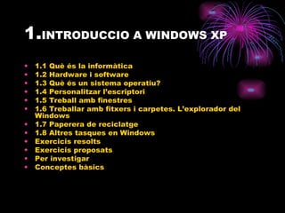 1. INTRODUCCIO AWINDOWS XP 1.1 Què és la informàtica 1.2 Hardware i software 1.3 Què és un sistema operatiu? 1.4 Personalitzar l’escriptori 1.5 Treball amb finestres 1.6 Treballar amb fitxers i carpetes. L’explorador del Windows 1.7 Paperera de reciclatge 1.8 Altres tasques en Windows Exercicis resolts Exercicis proposats Per investigar Conceptes bàsics