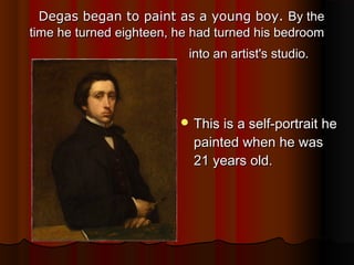 Edgar Degas began painting as a young boy and turned his bedroom into an artist's studio by age 18. He initially wanted to paint historical scenes but found everyday scenes more interesting. He moved to Paris and became known for his paintings of ballet dancers and Paris nightlife, spending hours studying dancers' movements in dance studios. One of his most famous works is Little Dancer of Fourteen Years, which depicted a dancer at rest in an unposed manner and used real elements like hair, ribbons, and tutus to make the scene feel authentic.