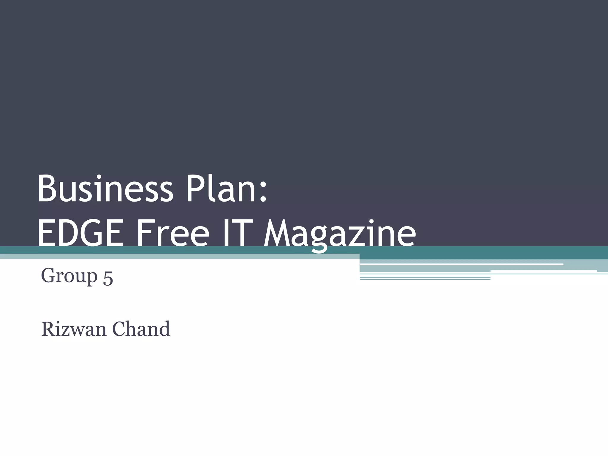This document provides a business plan for a proposed free IT magazine called EDGE. The plan outlines the magazine's mission to deliver information, ideas, creativity, and exposure to customers in the IT field. It will have a wide range of content and tutorials at an affordable price point. The marketing strategy is to attract advertisers by targeting a wide range of IT-interested readers. Financial projections estimate initial losses that will be recouped once circulation reaches 50,000 copies per month and advertising sales of over $30,000 per issue are achieved. The operational plan details costs, locations, delivery, and a small initial staff.