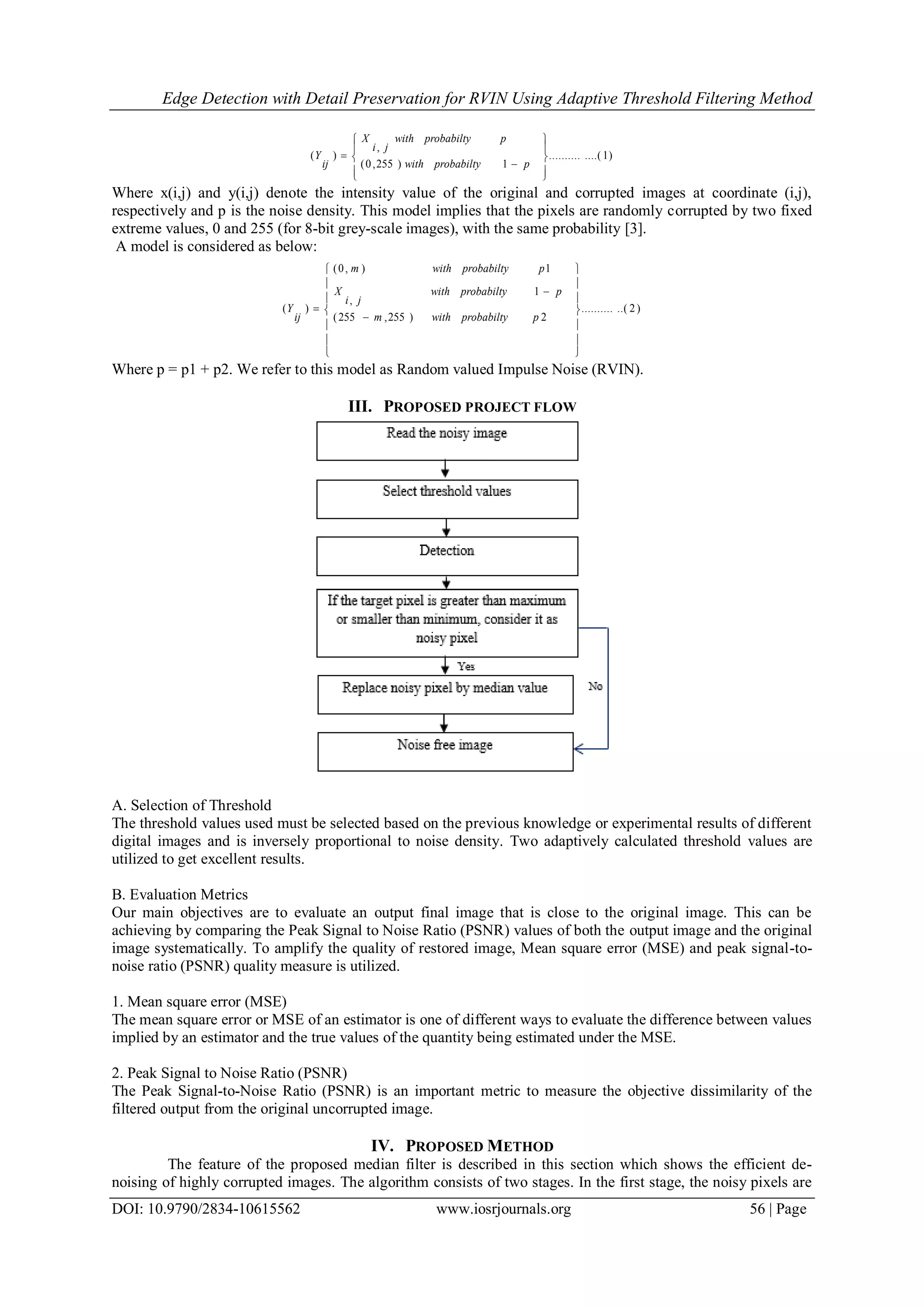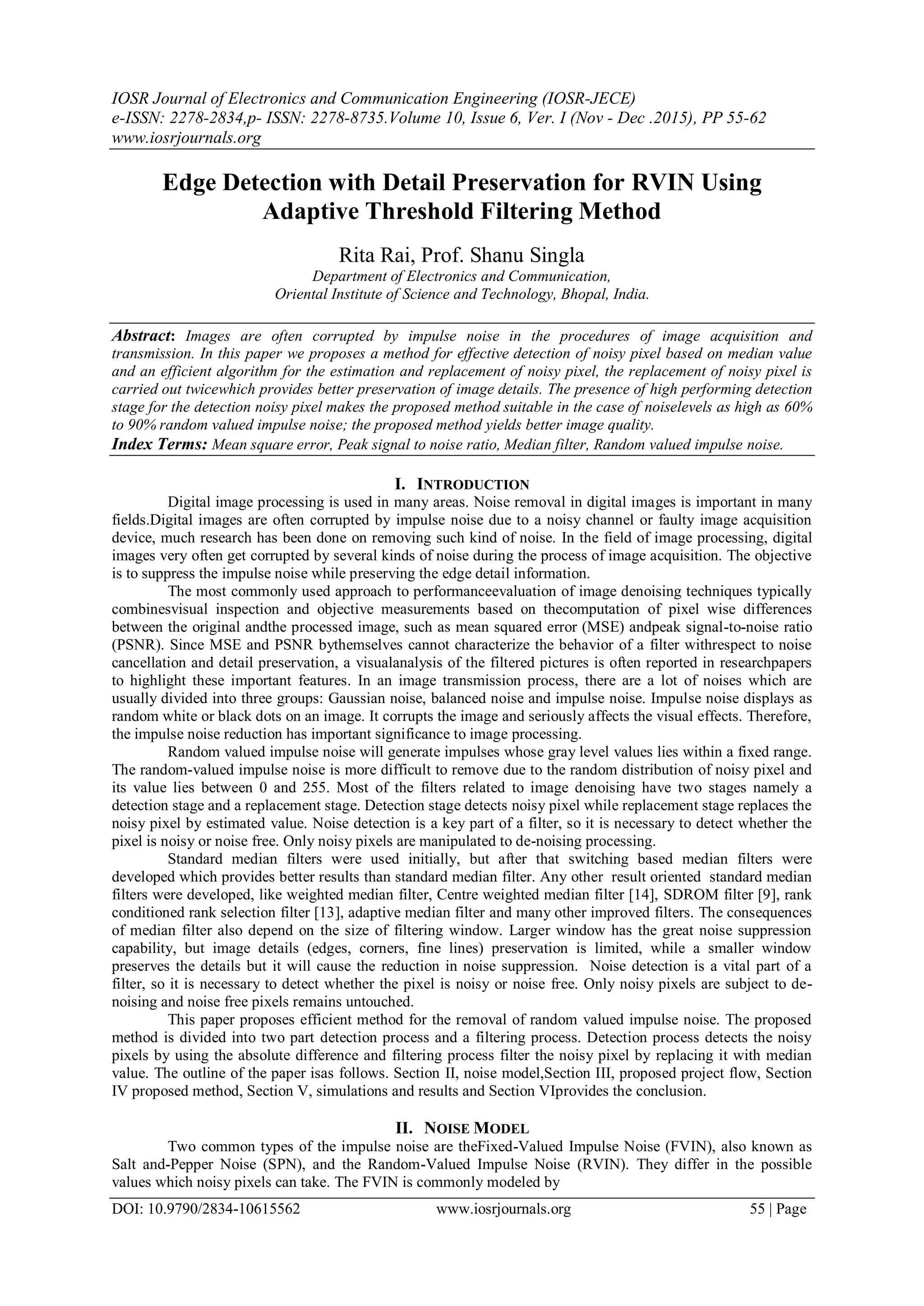 This paper presents a method for effective detection and removal of random valued impulse noise in digital images, focusing on median filtering with detail preservation. The proposed technique utilizes adaptive threshold filtering, which successfully identifies noisy pixels and replaces them to enhance image quality, particularly at high noise levels ranging from 50% to 90%. Results demonstrate that this method outperforms traditional filtering techniques in terms of peak signal-to-noise ratio (PSNR) and mean square error (MSE).