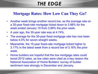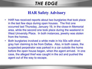 The document discusses recent record low mortgage rates below 4.0% for seven straight weeks which home builders hope will boost home sales in 2012, it then provides a safety advisory about two burglaries during open houses with a description of the suspect, and asks agents to remind sellers to secure valuables and be cautious during showings.