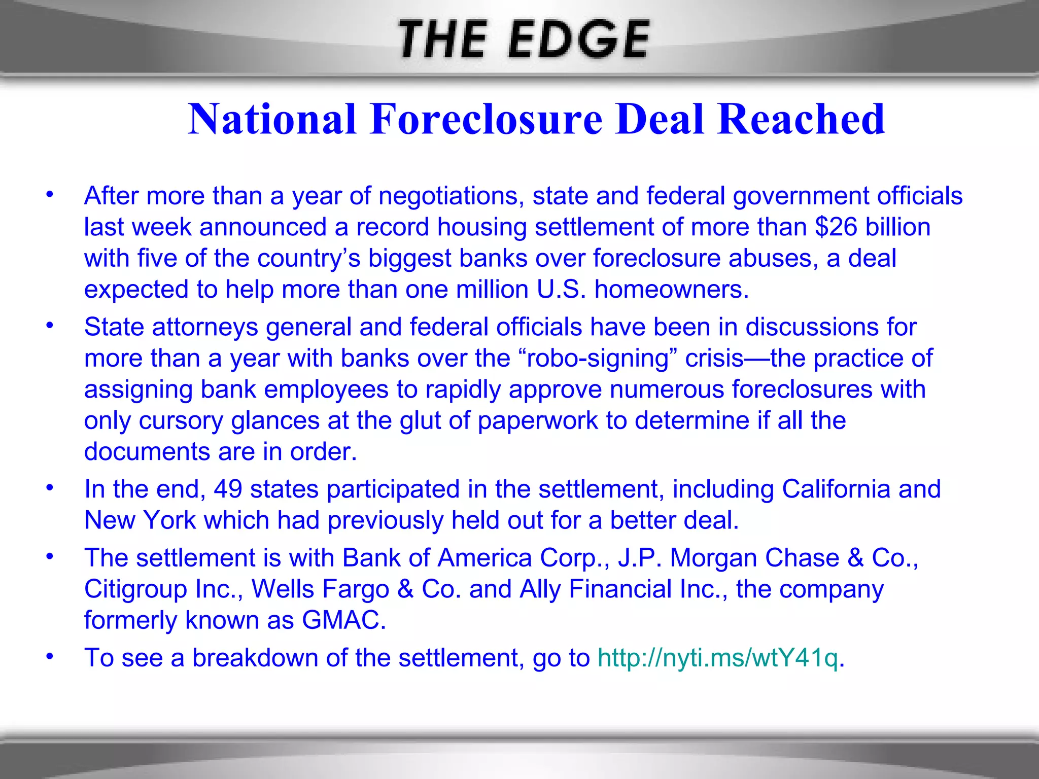 A record $26 billion settlement was reached between state and federal officials and five of the largest banks over foreclosure abuses related to robo-signing. The settlement is expected to help over 1 million homeowners and involved 49 states. Mortgage rates have remained at record lows around 3.87% for 30-year fixed loans, providing incentive for home buying and refinancing. Local housing market activity in Houston increased from the same week last year with more new listings, pending sales, and closed sales as well as fewer active listings on the market.