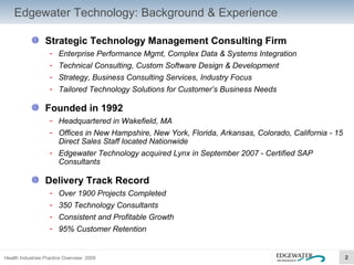 The document provides an overview of Edgewater Technology, a strategic technology management consulting firm focused on the healthcare industry. It describes Edgewater's background, services, industry experience, and case studies working with healthcare organizations to implement enterprise data strategies, data warehouses, business intelligence solutions, and other technologies. Key goals for healthcare clients included improving patient outcomes, increasing efficiency and compliance through data-driven insights.