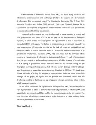 This document analyzes the development of e-government in the local government of Kudus, Indonesia using a SWOT analysis. A field study identified strengths, weaknesses, opportunities, and threats related to e-government development. Matching and converting strategies were used to develop recommendations from the SWOT analysis. Short-term recommendations include improving ICT training and infrastructure. Medium-term plans involve purchasing new database software and surveying citizens. Long-term strategies include updating the e-government master plan and funding higher education for officers in related fields. The analysis aims to improve e-government and better serve citizens in the future.