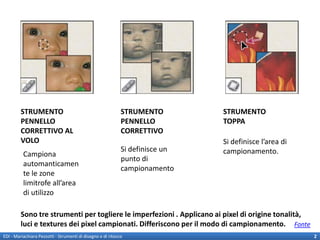 Il documento descrive vari strumenti di disegno e ritocco, come il pennello correttivo, il timbro clone e le funzioni di riempimento in base al contenuto. Ogni strumento è accompagnato da dettagli sulle opzioni e le impostazioni personalizzabili, che consentono di modificare immagini attraverso vari metodi di fusione e caratteristiche specifiche. Inoltre, si evidenziano tecniche per la correzione e il miglioramento visivo delle immagini, come sfocature, contrasti e saturazioni.
