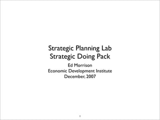 The document outlines a strategic planning lab on strategic doing. It discusses the traditional linear model of strategic planning and proposes an emerging model of strategic doing that is more networked, collaborative, and focused on continuous civic engagement. The lab agenda includes examining the current state of strategic planning practice and emerging practices of strategic doing through workshops and exercises. Case studies are presented on strategic planning processes in various communities.
