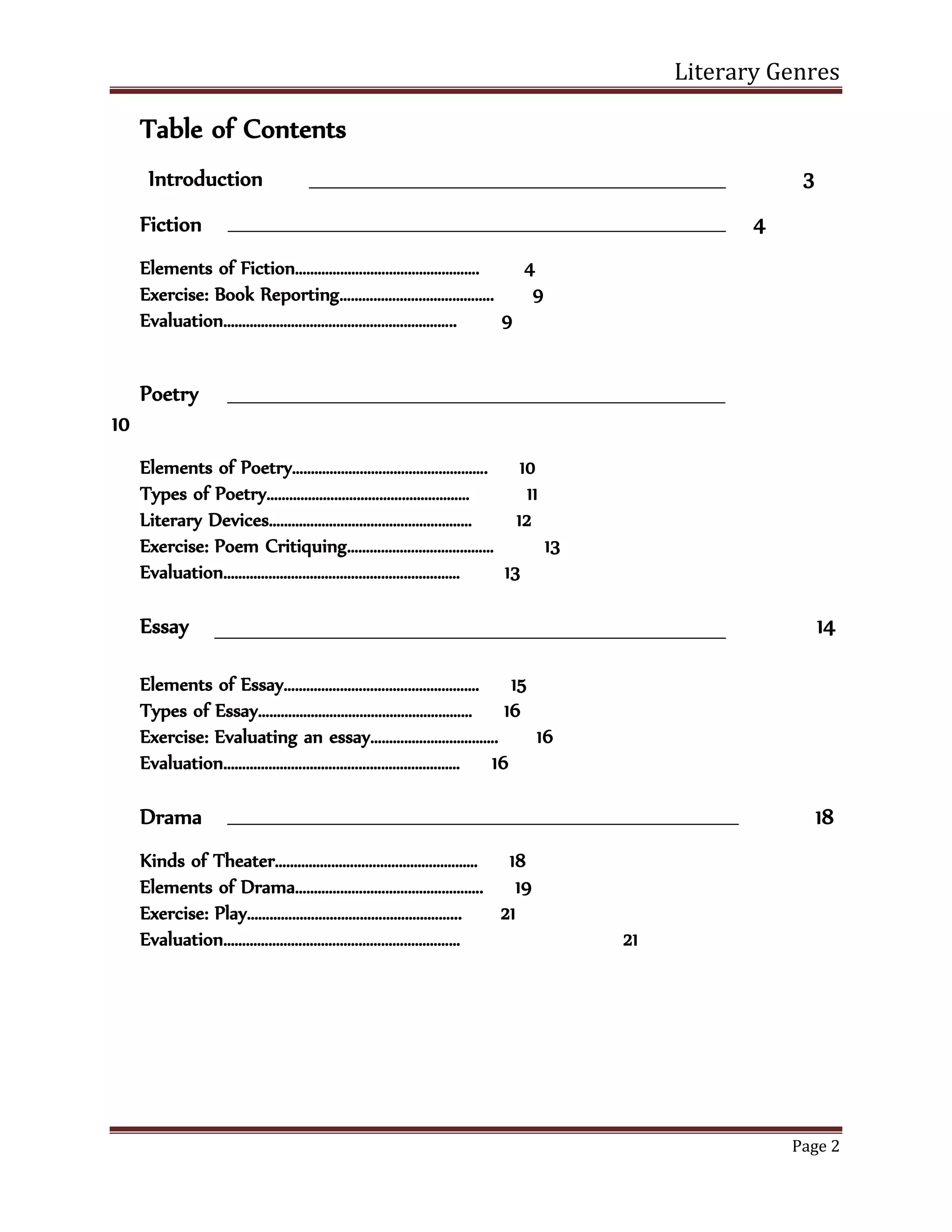 This document provides an overview of the different elements of fiction as a literary genre. It defines fiction as an imaginative recreation of life that includes short stories and novels. It then describes 10 key elements of fiction - characters, setting, conflict, plot, point of view, mood, tone, symbolism, images, and theme. For each element, the document provides details on their definition and purpose within a work of fiction. It also includes examples and exercises for students to practice analyzing works of fiction using these elements.