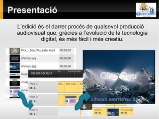 Presentació L’edició ésel darrer procés de qualsevol producció audiovisual que, gràcies a l’evolució de la tecnologia digital, és més fàcil i més creatiu.
