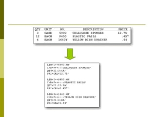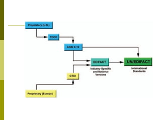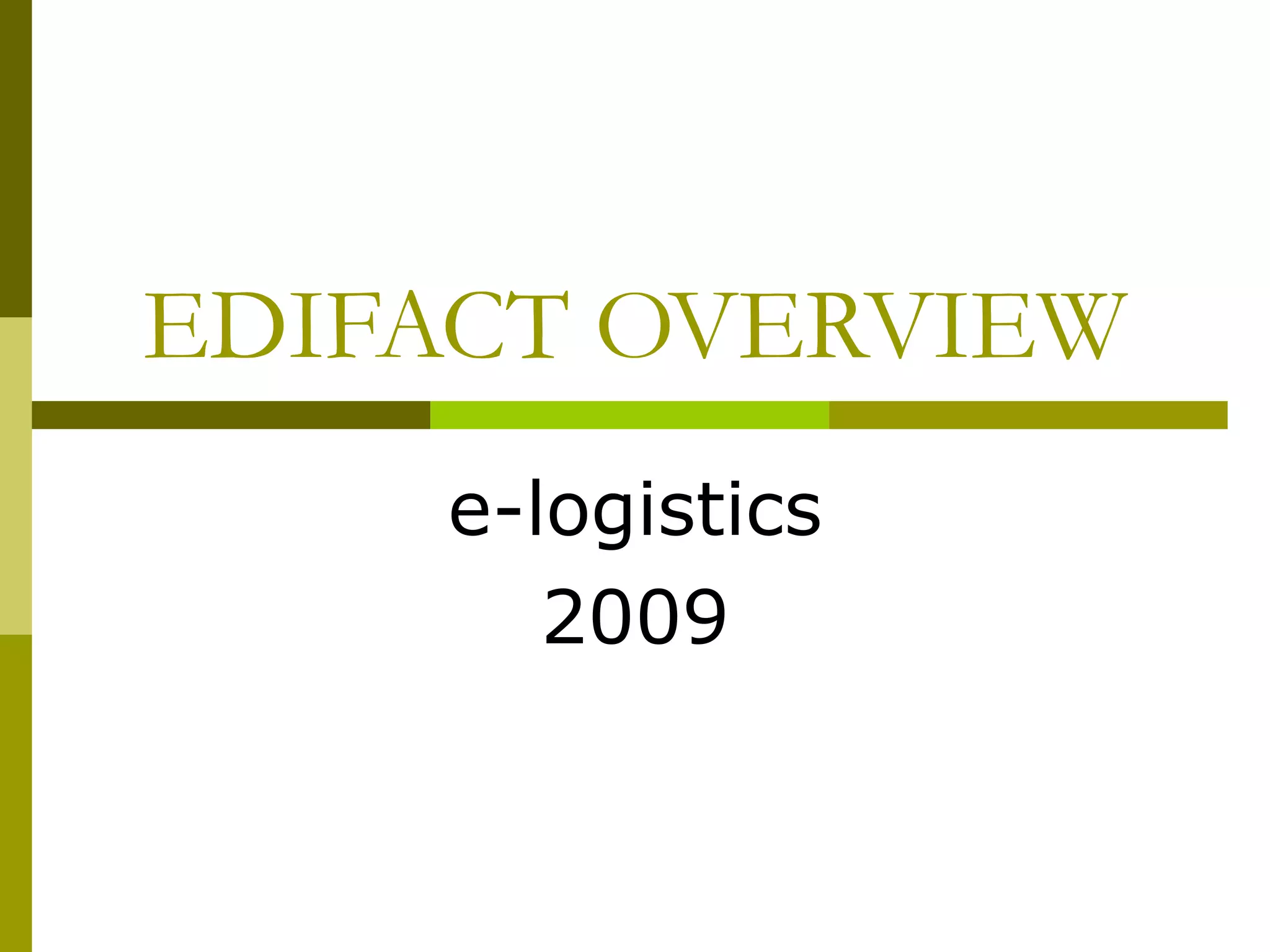 The document provides an overview of EDIFACT (Electronic Data Interchange For Administration, Commerce and Transport), which is an international standard for electronic data interchange (EDI). Key points include that EDIFACT defines syntax rules, data elements and message structures to facilitate electronic interchange between organizations. It describes the different levels of "electronic enveloping" that structure EDIFACT messages and provides examples of common EDI message types and their segment structures.