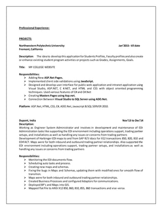 Gowtham is an EDI Developer with over 2 years of experience implementing EDI using GIS and developing EDI maps. He has worked with various ANSI X12 and EDIFACT transactions and has experience integrating trading partners into GIS. He has also worked on projects involving developing ASP.NET websites for student and faculty profiles at Northwestern Polytechnic University and was a System Administrator at Dupont India where he developed EDI maps between GIS and SAP.