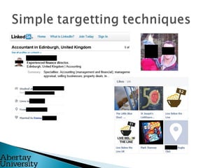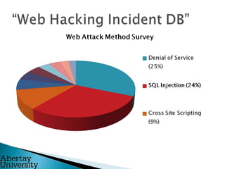 Colin McLean gave a presentation on SQL injection vulnerabilities and hacking. He demonstrated how easily a hacker could exploit an SQL injection flaw to extract sensitive data like usernames, passwords and bank account information from a vulnerable web application. He emphasized that awareness is key to mitigating hacking threats, as most modern attacks require user interaction, such as clicking a malicious link. Abertay University offers various cybersecurity training courses to help improve awareness.