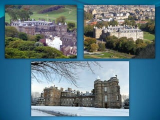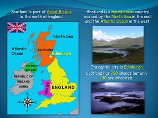 Scotland is a mountainous country located north of England. Its capital and largest city is Edinburgh, known for its medieval Old Town and grand New Town architecture. Scotland has a long history and is divided into Highlands and Lowlands regions. It is famous for its lochs, castles, and cultural festivals like the Edinburgh Festival Fringe. Famous Scottish people include writers Robert Burns, Sir Walter Scott, and J.K. Rowling. Edinburgh hosts annual cultural festivals that attract over 1 million visitors each year, making it a major tourism destination.