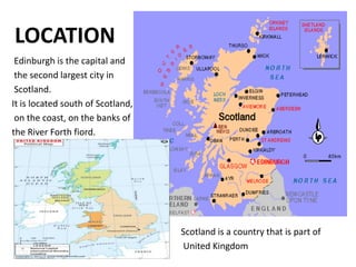 Edinburgh is the capital city of Scotland located on the Firth of Forth coast. It has a population of around 500,000 inhabitants and features a temperate oceanic climate. Important landmarks include Edinburgh Castle, Holyrood Palace, the Royal Mile street, and several gardens and parks. The city is known for its medieval old town, annual international arts festival, and Scottish cuisine including haggis and whisky.