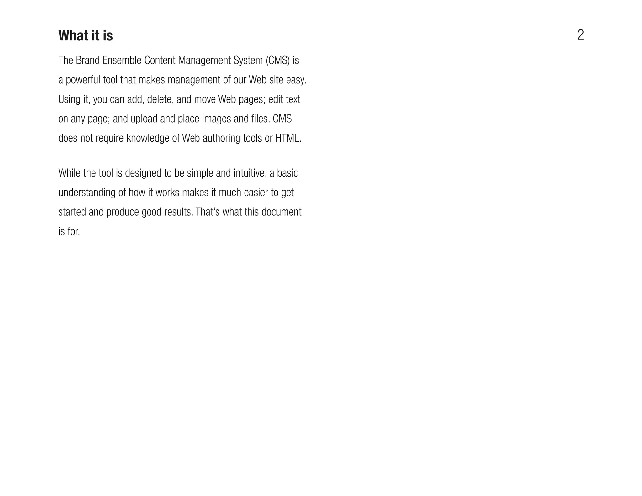 The Brand Ensemble Content Management System (CMS) allows users to easily add, edit, and manage website content without requiring knowledge of HTML or web authoring tools. The quick start guide provides an overview of the CMS interface and walkthroughs for common tasks like creating pages, editing content, inserting images and files, publishing pages, and moving or deleting pages. It emphasizes maintaining the overall site structure, style, and brand integrity when making changes.