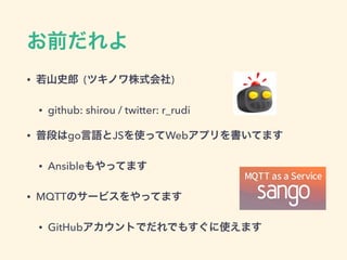 github: shirou / twitter: r_rudi • 普段はgo言語とJSを使ってWebアプリを書いてます • Ansibleもやってます • MQTTのサービスをやってます • GitHubアカウントでだれでもすぐに使えます