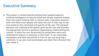 The document details a project aimed at developing AI-powered smart glasses to assist blind and visually impaired individuals in their daily lives, allowing them to navigate and access information through voice commands. The glasses are designed to provide context-aware support, dynamic alerts, and the ability to read text, thus promoting independence for users. Future enhancements aim to make the technology widely available, potentially revolutionizing communication and accessibility for those with disabilities.